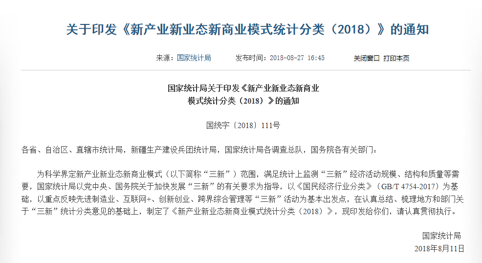 近日,為科學(xué)界定新產(chǎn)業(yè)新業(yè)態(tài)新商業(yè)模式(以下簡稱“三新”)范圍,滿足統(tǒng)計(jì)上監(jiān)測“三新”經(jīng)濟(jì)活動(dòng)規(guī)模、結(jié)構(gòu)和質(zhì)量等需要,國家統(tǒng)計(jì)局以黨中央、國務(wù)院關(guān)于加快發(fā)展“三新”的有關(guān)要求為指導(dǎo),以《國民經(jīng)濟(jì)行業(yè)分類》(GB/T 4754-2017)為基礎(chǔ),制定了《新產(chǎn)業(yè)新業(yè)態(tài)新商業(yè)模式統(tǒng)計(jì)分類(2018)》。
