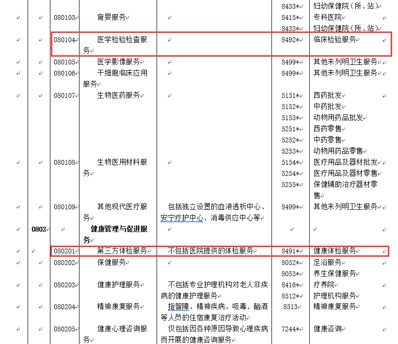 分類中明確將醫(yī)學(xué)檢驗(yàn)檢查服務(wù)列為現(xiàn)代醫(yī)療服務(wù),分類代碼080104、國民經(jīng)濟(jì)行業(yè)代碼8492,將第三方體檢服務(wù)列為健康管理與促進(jìn)服務(wù),分類代碼080201、國民經(jīng)濟(jì)行業(yè)代碼8491。